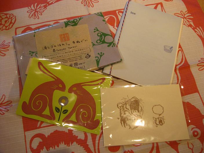 消しゴムはんこを知るきっかけになった我が師匠(と勝手に呼んでいる)津久井智子さん直捺しのハガキとはんこによるデザインのてぬぐいを買い、