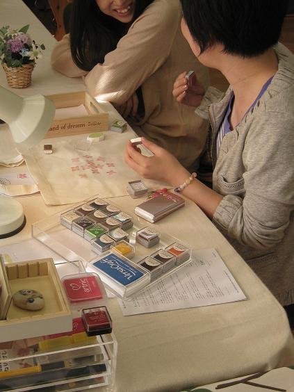 消しゴムはんこそのものの展示・販売、消しゴムはんこをペタペタした小物の販売に加え、体験講座を随時開講しました。