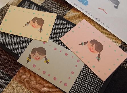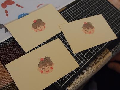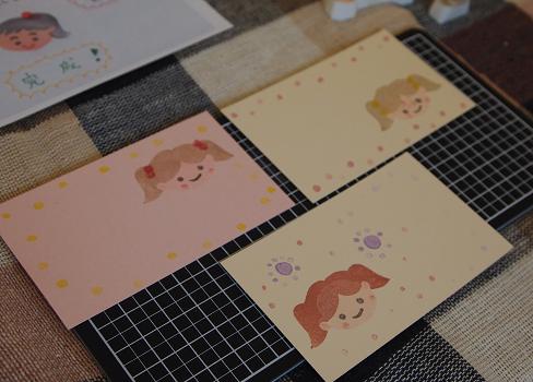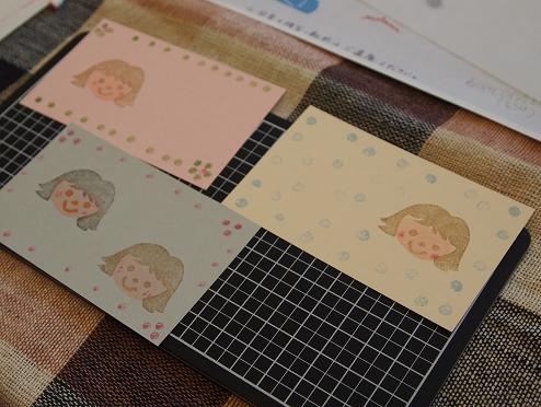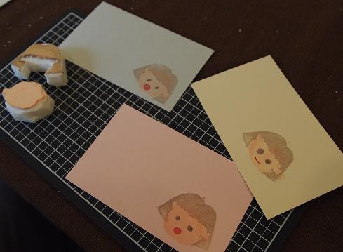 顔の輪郭、髪型、表情の3つのはんこを作って組み合わせた後に、綿棒やねり消しを使っておめかしさせるというちょっとしたワンポイントをお伝えしましたが、顔だけではなくカードそのものをねり消しはんこでかわいく飾ったり、お花を咲かせたり。