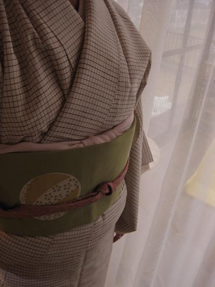 今日の着物は、白地に赤の格子の紬に、浴衣地で誂えた帯。